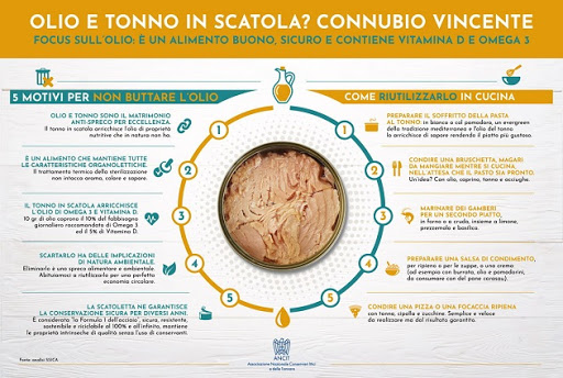 In epoca di economia circolare e lotta allo spreco, che il tonno in scatola sia l’alimento anti-spreco per eccellenza è un dato di fatto. Solo l’1% del tonno che utilizziamo finisce nel cestino: non si butta praticamente mai (neanche quando è avanzato), non si fa mai scadere e si ricicla completamente. La novità riguarda l’olio presente nella scatoletta di tonno: un alimento a tutti gli effetti, sicuro, che mantiene buone caratteristiche organolettiche e che può essere, utilizzato come condimento o ingrediente in cucina e non essere buttato come uno scarto.